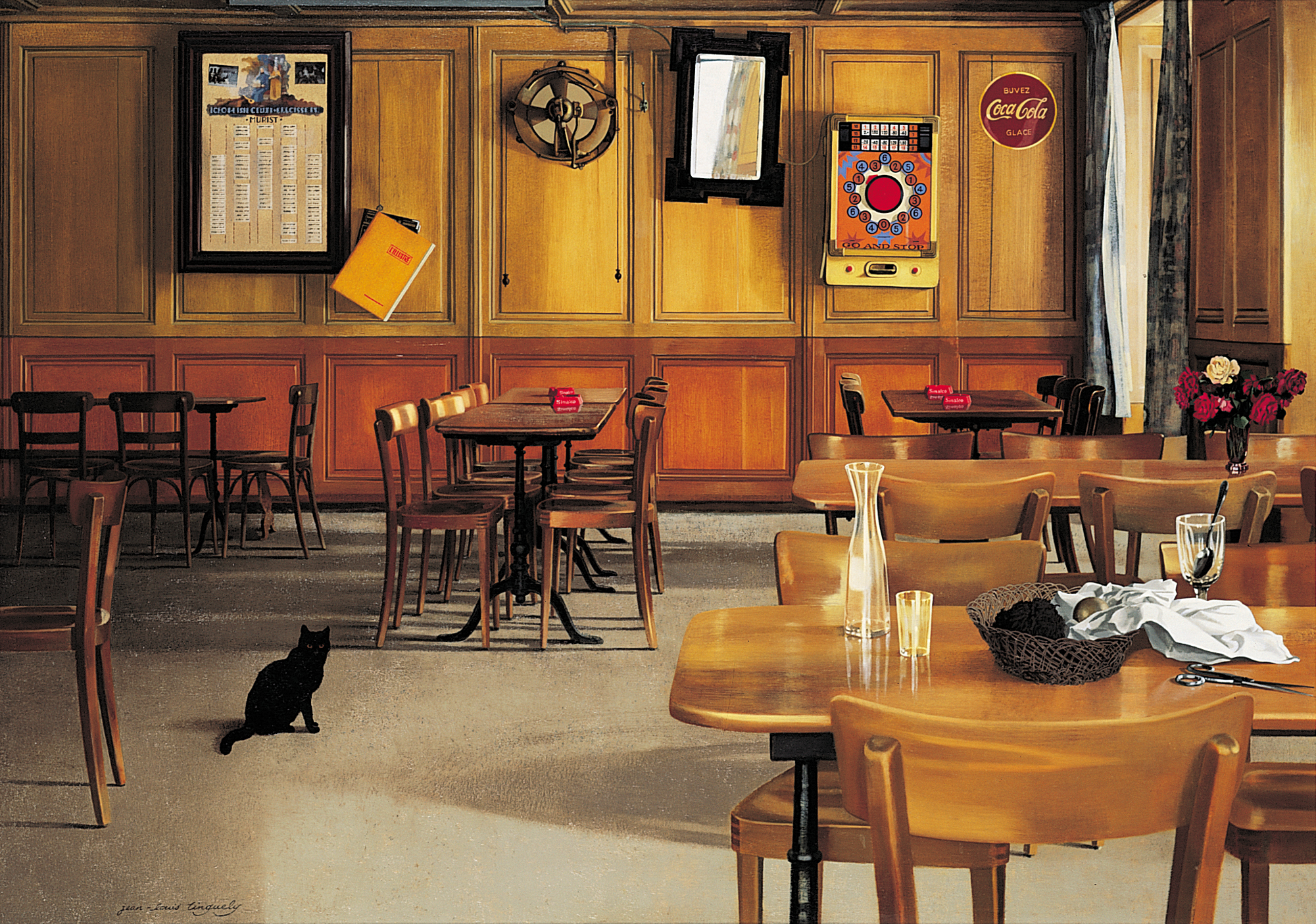Analyse d'une oeuvre de l'artiste fribourgeois Jean-Louis Tinguely qui projette des photos de l'intérieur du café sur sa toile avant de les peindre. Les élèves déterminent s'il s'agit d'un simple décalquage ou d'une œuvre d'art.